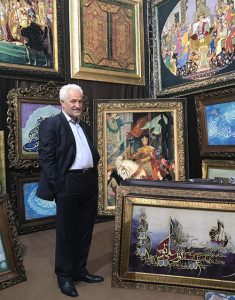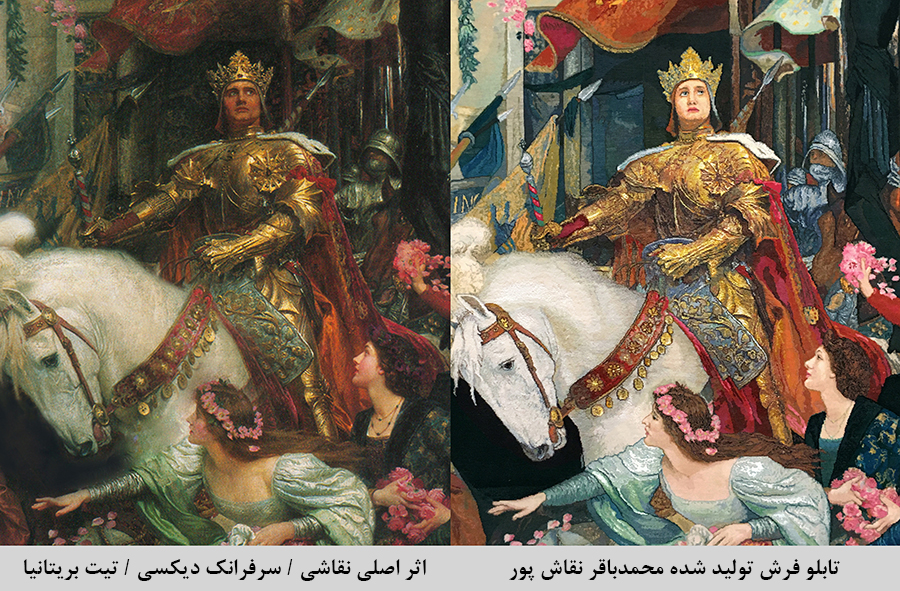 فرش ایرانی همچون یک تابلوی نقاشی بزرگی است که با ابزار و تکنیکهای پیچیدهتر و با مشارکت جمعی از هنرمندان ساخته میشود. رنگها در پشم و ابریشم ایجاد شده و گره به گره با دست بر تاروپود بافته میشوند تا تصویری شکل بگیرد؛ بهاینترتیب، ما نقاشیهایمان را در قالب فرش ایرانی میبافیم.