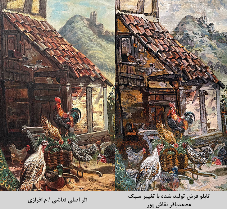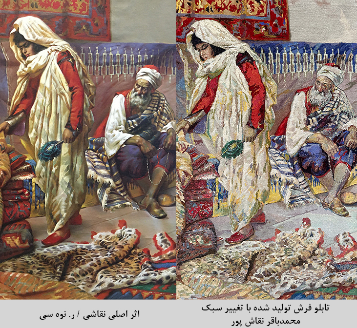 با بیش از یکصد و ده سال سابقه خانوادگی در فرشهای دستباف تبریز و بیش از نیمقرن مطالعات و تلاشهای بیوقفه استاد محمدباقر نقاش پور، مفتخریم که به لطف خداوند، سبکی منحصربهفرد در تولید فرش ایجاد کرده و با بهرهگیری از تکنیکها و سبکهای نقاشی در طرح و رنگآمیزی و ساخت رنگهای خاص خود در بهترین پشم و ابریشم، کوشیدهایم تا آنچه از جنس فرش تقدیم میشود، تصویری شایسته باشد؛ بهگونهای که با استفاده متفاوت از خواص نور و رنگ، ابعاد بیشتری از تصاویر موجود در فرش نمایان شده و بیننده همراه جذابیتهای بصری اثر شود.